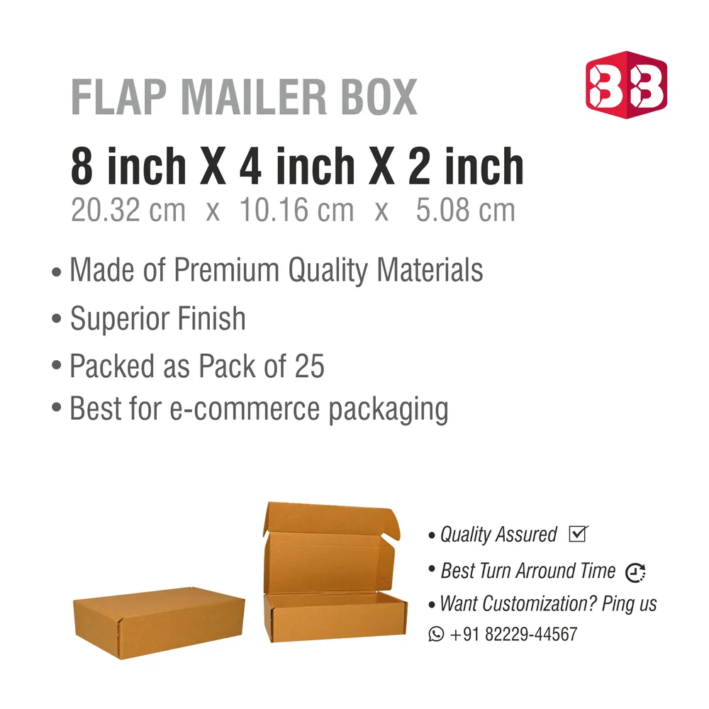 Box Brother 3 ply Brown Corrugated Carton Box: Flexible Size: The Box Brother 3 ply Brown Corrugated Carton Flap Box measures 8x4x2 inches, offering ample space for various items. This size is perfect for small electronic gadgets, skincare products, and other e-commerce items. Reinforced Strength: Built to last, the Box Brother 3 ply Brown Corrugated Carton Flap Box features reinforced edges, providing exemplary toughness throughout handling and shipment. Multi-Purpose Use: Ideal for packaging, moving, shipping, packing, home shifting, books, and storing. The classic brown tone of the Box Brother 3 ply Brown Corrugated Carton Flap Box adds a professional and classy feel to your parcels. Cube Shape Design: Optimized for effective space usage, the Box Brother 3 ply Brown Corrugated Carton Flap Box maximizes storage and transportation efficiency. Eco-friendly Option: Made from recyclable and renewable materials, the Box Brother 3 ply Brown Corrugated Carton Flap Box supports sustainability and environmental care. E-commerce Ready: Designed specifically for e-commerce, this custom carton box from Box Brother Production provides easy handling and superior product protection. Heavy Packing Capability: Despite its lightweight design, the Box Brother 3 ply Brown Corrugated Carton Flap Box can handle both light and heavy items, ensuring your goods are secure during transit. Choose Box Brother 3 ply Brown Corrugated Carton Flap Box for quality, durability, and sustainability. Enhance your packaging experience and ensure your goods are well-protected on their journey. Product Description: In the ever-evolving world of e-commerce, where customers demand reliable, safe, and efficient shipping options, the Box Brother 3 ply Brown Corrugated Carton Flap Box stands out as a flexible and essential choice. These corrugated carton boxes are designed to streamline shipping processes and ensure the safe transit of goods. High-quality Box Brother 3 ply Brown Corrugated Carton Flap Box measuring 8x4x2 inches. Ideal for packaging, moving, shipping, and storing various items. Corrugated carton boxes are made by layering multiple layers of fluted paperboard between robust linerboard sheets. This structure provides a robust design that can endure handling and transit abuses. The Box Brother carton box’s triple-layered design offers increased strength and resilience to crushing pressures, protecting the contents during transportation. Ideal Sizes for Adaptable Use: Measuring 8x4x2 inches, the Box Brother carton box is ideal for a variety of products commonly sold in e-commerce, including small electronic gadgets and skincare essentials. This size strikes a balance between compactness and capacity, offering sufficient room for various objects while reducing superfluous packing material and lowering shipping costs. Improved Product Safety: Maintaining product integrity during shipping is crucial. The Box Brother 3 ply Brown Corrugated Carton Flap Box’s corrugated structure acts as a cushioning barrier, absorbing shocks and vibrations experienced during handling and transit. The secure closure mechanism further minimizes the risk of accidents during transportation, ensuring contents stay safely contained. Eco-friendliness and sustainability: Corrugated carton boxes are an excellent choice for environmentally friendly packaging in a time when environmental sustainability is becoming more and more important. Constructed with recyclable and renewable resources, such paperboard from forests that are sustainably managed, these boxes support the ideas of sustainability and the circular economy. This dedication to environmental care is best shown by the Box Brother carton box, which offers companies a packaging choice that reduces their carbon footprint while delivering excellent performance. Affordable Shipping Options: In addition to its environmental credentials and protective properties, corrugated carton boxes, such as the Box Brother model, have practical advantages in terms of cost- and shipping-effectiveness. Because to its sturdy yet lightweight design, less freight is shipped overall, saving businesses money on freight expenses. Standardized dimensions also make it easier to stack items and optimize available space, which makes storage and transportation in warehouses and delivery trucks more effective. High-quality Box Brother 3 ply Brown Corrugated Carton Flap Box measuring 8x4x2 inches. Ideal for packaging, moving, shipping, and storing various items When it comes to e-commerce packaging, the Box Brother 3 ply Brown Corrugated Carton Box is the best option available. Its optimal dimensions, robust design, and eco-friendliness make it a top pick for companies looking for dependable shipping solutions that value product protection, sustainability, and affordability. Corrugated carton boxes are an essential tool for businesses and consumers alike as the e-commerce industry develops, guaranteeing that goods arrive at their destination securely and safely each and every time. FAQs: Q: What are the dimensions of this carton box? A: The dimensions are 8x4x2 inches (LxWxH). Q: Is this box suitable for heavy items? A: Yes, the Box Brother 3 ply Brown Corrugated Carton Flap Box is designed to handle both light and heavy items. Q: Is this box eco-friendly? A: Yes, the Box Brother 3 ply Brown Corrugated Carton Flap Box is made from recyclable and renewable materials. Q: Can I use this box for e-commerce shipping? A: Absolutely, the Box Brother 3 ply Brown Corrugated Carton Flap Box is designed specifically for e-commerce with easy handling and superior product protection. Ready to upgrade your packaging? Choose the Box Brother 3 ply Brown Corrugated Carton Flap Box for unmatched quality, durability, and sustainability. Perfect for all your e-commerce needs, this versatile box ensures your products are well-protected on their journey. Order now and experience the difference in quality packaging. Click "Add to Cart" to ge