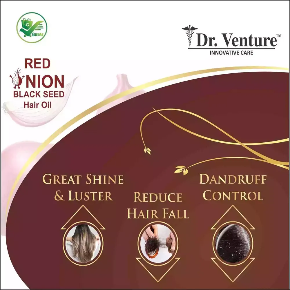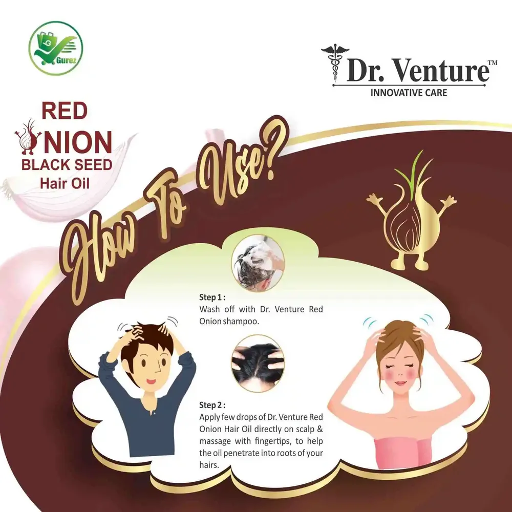 The Dr. Venture Red Onion Shampoo and Onion Hair Oil combo pack will improve your hair care regimen. This set of two potent products is made to provide your hair with the best possible nourishment and protection. Natural ingredients like Red Onion, Curry Leaf, Coffee Bean, Alkanet Root, Aloe Gel, Argan Oil, Castor Oil, Amla, Amarbel, and others are used to make Red Onion Shampoo. Together, these organic wonders strengthen hair strands, enhance hair texture, and fight dandruff and hair loss. This shampoo is paraben, silicone, sulfate, and color-free, so say goodbye to dangerous additives. The power of onion black seed oil is harnessed in Onion Black Seed Hair Oil along with other botanical oils and 100% pure cold-pressed extra virgin natural essential oils like tea tree oil, castor oil, jojoba oil, olive oil, almond oil, and coconut oil. This non-sticky, non-greasy solution works wonders on hair to make it stronger and silkier. Its quick absorption guarantees excellent scalp and hair care. Enjoy total hair protection as these products aid in the battle against free radicals, leaving your hair moisturized and renewed. Together, red onion extract and black seed oil can revitalize brittle hair and worn-out scalps. Watch your hair change into its healthiest, most beautiful state by upping your hair care game with this powerhouse pair. Onion Shampoo Made With Natural ingredient:- Dr. Venture Onion Shampoo is Made With Natural ingredients like Red Onion, Curry Leaf, Coffee Bean, Alkanet Root, Aloe Gel, Argan Oil, Castor Oil, Amla, Amarbel More Natural ingredients Almond oil has been utilized for quite a long time to treat dry skin conditions, including dermatitis. Improves skin inflammation. The oil's unsaturated fat substance may help disintegrate the abundance of oil on the skin, while the retinoids in the oil may lessen the presence of skin breakouts and improve cell turnover. Assists turn around with sunning harm help your hair fight free radicals, and leave them feeling hydrated & regenerated. Onion extract, and black seed oil aid in rejuvenating tired scalps and weak hair. Use this shampoo to help improve hair texture and strengthen the strands onion extract, and black seed oil aid in rejuvenating tired scalp and weak hair. Use this shampoo to help improve hair texture and strengthen the strands The shampoo & conditioner works on your hair to cleanse away buildup and improve the quality of strandsDr. Venture Red Onion Shampoo Combo Pack: