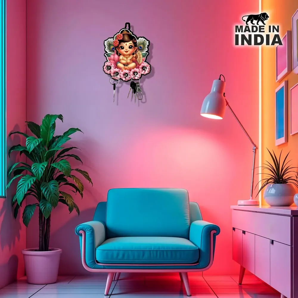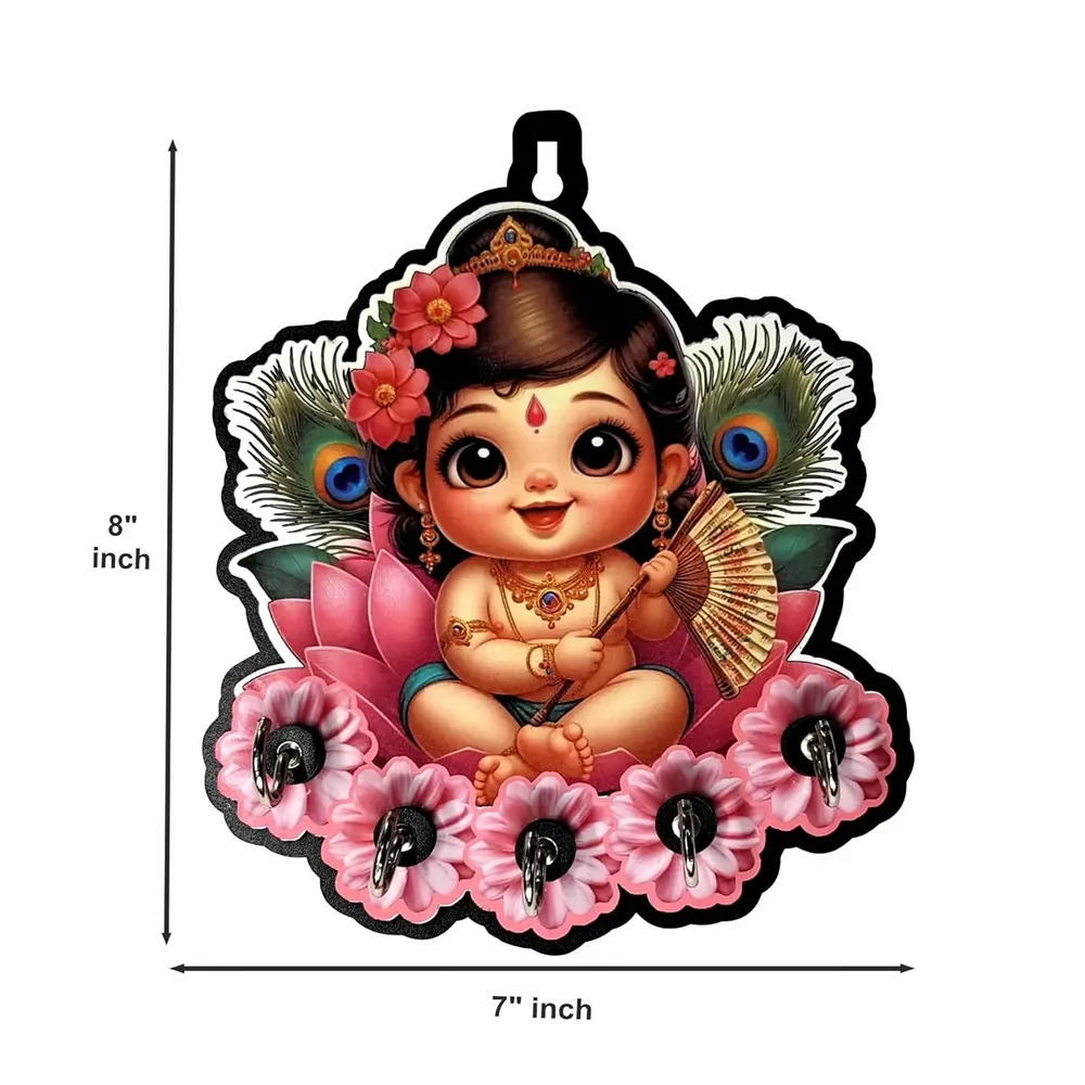 Feature Details Brand Woodkey by Gurez Product Type Wooden Key Holder / Key Stand Design Baby Krishna Decorative Spiritual Theme Material Premium Quality Engineered Wood Hooks 5 Durable Metal Hooks Mounting Type Wall Hanging Usage Home, Office, Puja Room, Gifting Style Decorative + Functional Dimensions Compact, Easy-to-Mount Size Made In India Benefits of the Krishna Wooden Key Holder