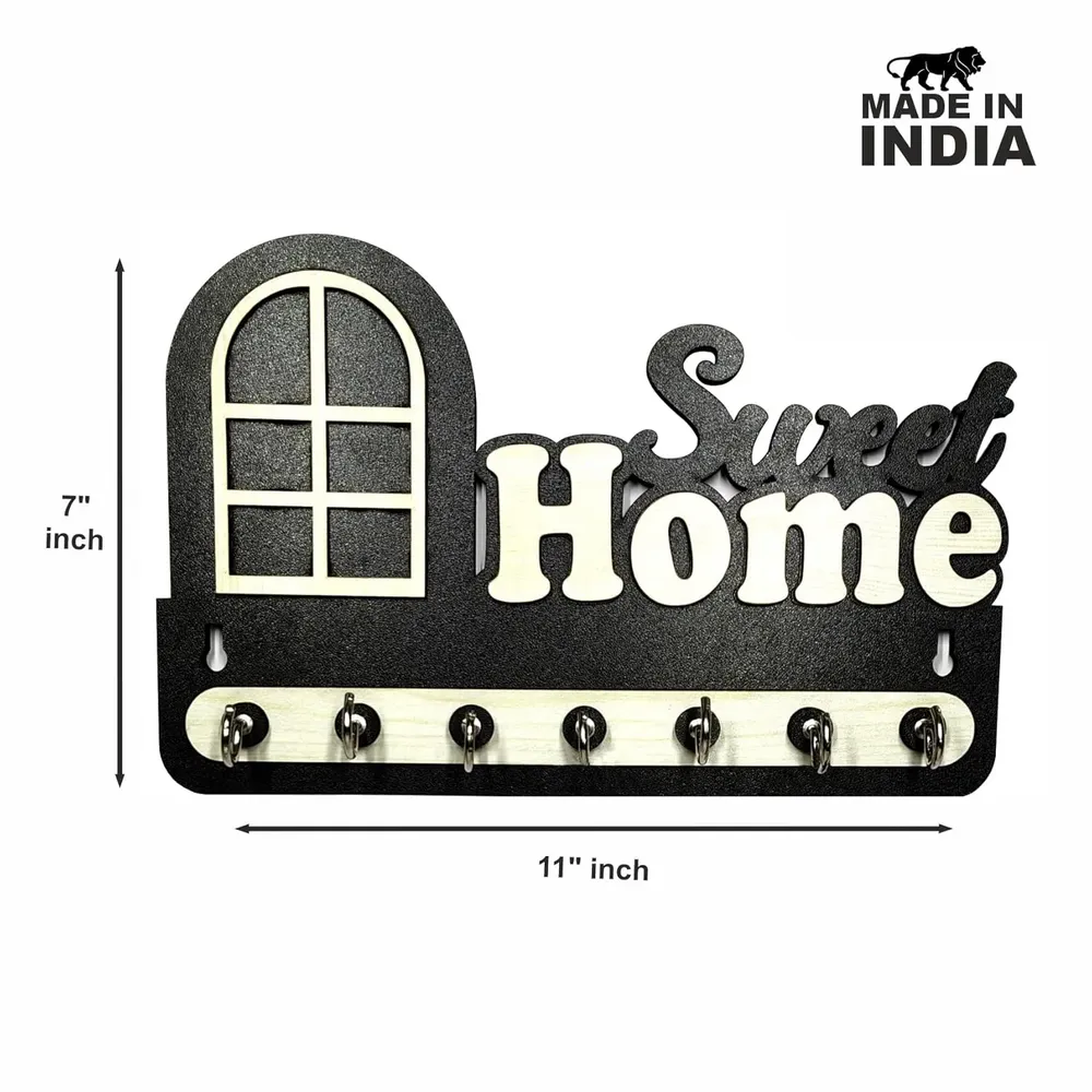 Feature Details Product Type Wall Hanging Key Holder Design “Sweet Home” Text with Window Design Material Premium MDF Wood Color Black & White Combination Dimensions 11 x 7 inches (Approx.) Hooks 7 Durable Metal Hooks Mount Type Easy Wall Mounting Made In Proudly Made in India The Role of a Wall Key Holder in Daily Life