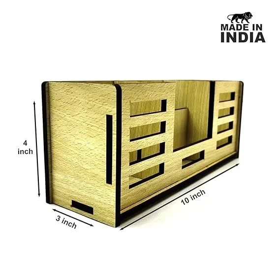 Woodkey 4-in-1 Wooden Desk Organizer | Pen Stand, Mobile Holder, Visiting Card & Stationery Tray | Intal beech Finish | Office & Study Table Accessory