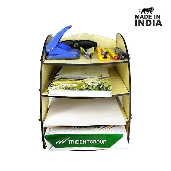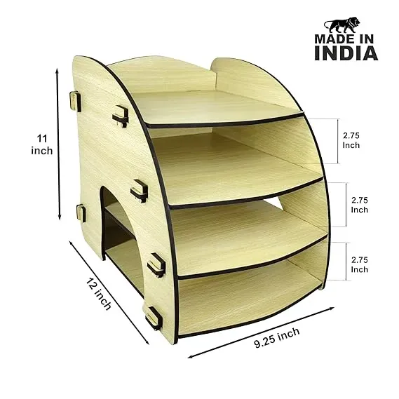 Woodkey 4-Tier File Tray In today’s hybrid work culture, whether you're managing tasks from a corporate desk, home workstation, or study table, a clean and organized space makes all the difference. That’s where the Woodkey A4 Desk File Tray Organizer (Intal Beech Edition) comes in. Crafted from durable engineered wood and finished in a light, natural Intal Beech tone, this 4-tier tray is both functional and elegant. It neatly organizes your paperwork, notebooks, and daily office essentials keeps your phone upright and accessible — perfect for video calls or multitasking. Top Features: 4-Tier Storage – Paper, files, books, and documents Compact Size – Fits perfectly on any standard desk Eco Build – Made from sustainable engineered wood Elegant Beech Finish – Soft color that complements any décor Every Woodkey file tray is precision cut, hand-finished, and made to last. The smooth matte surface resists stains, and the rounded edges make it safe and stylish for all age groups. Yes, it’s designed to carry daily-use files, folders, and small books. No tools required. It has a simple slot-in assembly design. No, it has a clean vertical profile and doesn’t take up much space. Great for students, professionals, teachers, or anyone working with paper daily.Product Info Table: Woodkey A4 Desk File Tray Organizer