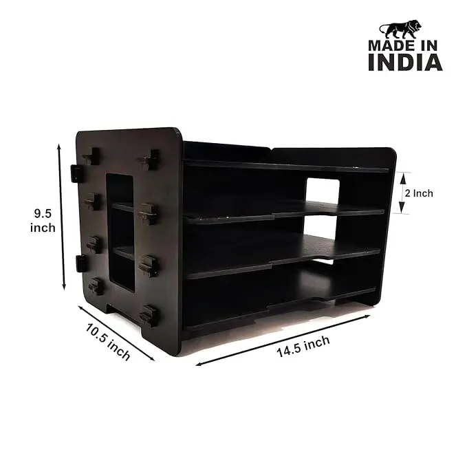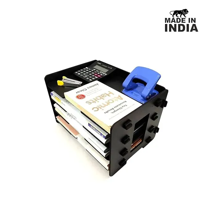 Feature Details Brand Woodkey Product Name 4-Tier Desk File Tray Organizer Color Black (Natural Wood Tone) Material High-Quality Engineered Wood Dimensions Suitable for A4, Letter Size & Office Files Finish Smooth Matte with Wood Grain Texture Capacity 4 Storage Trays + Top Surface Mobile Holder Not Included Assembly Pre-Assembled/Slot-Based – No Tools Needed Eco-Friendly Yes – Sustainable Engineered Wood Made in India ✔️ 100% Designed & Crafted in India Ideal For Office, Study, Admin Desks, Corporate Gifts Top Features: Woodkey 4-Tier Desk Organizer
