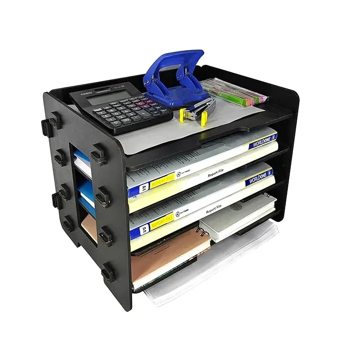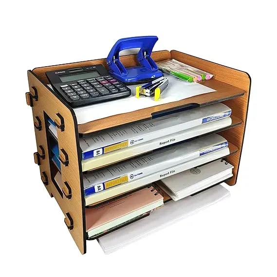 Feature Details Brand Woodkey Product Name All-in-One Wooden Desk Organizer – File Tray + Rack + Drawer Color Intal Beech Material High-Quality Engineered Wood Dimensions Supports A4/Letter Files, Books, Tools Finish Matte Finish with Natural Wood Texture Storage Layout 4 Horizontal Trays + Side Rack + Pen Holder + Drawer Mobile Holder Not Included Assembly Slot-in Design – Tool-Free Setup Eco-Friendly Yes – Plastic-Free & Recyclable Made in India ✔️ Proudly Crafted in India Ideal For Study Desks, Office Setups, Reception, Admin Tables Special Features Space-saving multi-utility design with smooth edges Top Features: All-in-One Wooden Desk Organizer
