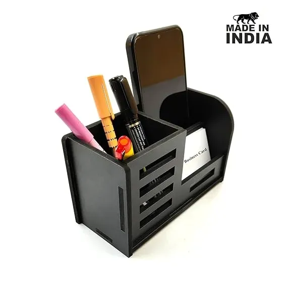 Feature Specification Product Name Woodkey Multipurpose Wooden Desk Organizer Material Black Wood Usage Pen Stand, Mobile Holder, Visiting Card Slot Finish Matte Wooden Polish Ideal For Office, Home Desk, Study Table Dimensions Approx. 18 x 10 x 8 cm Compartments 3 sections (Pens, Cards, Phone) Color Natural Wooden Shade Brand Woodkey by Gurez Price ₹178 Bullet Highlights: