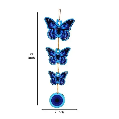 Feature Details Brand Woodkey Product Name Blue Butterfly Wooden Wall Hanging with Evil Eye Material High-quality MDF Wood Design Elements 3 blue butterflies with a hanging evil eye charm Purpose Luck, positivity, prosperity, and home decor accent Placement Living room, door, entrance, pooja room, office walls Color Theme Vibrant shades of blue, black & white Dimensions Approx. 12 to 15 inches long (when hanging) Target Audience Homeowners, spiritual decor buyers, gift shoppers Made In Proudly Made in India 🇮🇳 The Meaning Behind the Design
