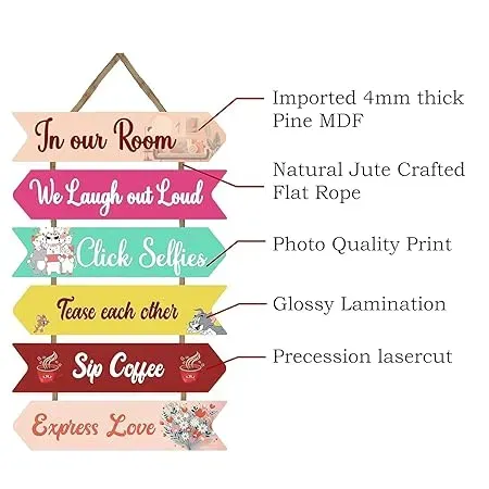 Room Wall Hanging Your room isn’t just four walls and a bed — it’s your world. It’s where friendships are built, coffee is shared, memories are made, and selfies are clicked. And now, with the Woodkey "In Our Room" Wooden Wall Hanging, you can bring all that energy to your wall in the most fun, colorful, and creative way possible. This vibrant wall décor piece is designed for those who love to decorate their personal space with a touch of personality. Whether it’s a hostel room, a shared flat, your home study, or a cozy office nook, this hanging captures the spirit of modern youth culture — where fun and emotion meet! The Woodkey In Our Room Wall Hanging is a 6-layered wooden MDF décor piece designed to visually express the vibe of any casual or shared space. Each layer features a fun phrase printed in bold, beautiful fonts like: In Our Room We Laugh Out Loud Click Selfies Tease Each Other Sip Coffee Express Love Crafted from premium-quality engineered MDF wood, the wall hanging is lightweight, durable, and comes with a pre-attached hanging thread. Measuring approximately 60x30 cm, it fits perfectly on doors, empty walls, above desks, or beside beds. This hanging is not just decorative — it’s a conversation starter. It speaks the language of friendship, love, and everyday moments. Relatable Quotes: Every line resonates with real-life roommate or friend moments. Bold & Beautiful: Colorful layout instantly brightens up a dull wall. Affordable & Thoughtful: Great for gifting without spending a fortune. Zero Setup Required: Just unbox and hang — no drilling or tools needed. Fits Anywhere: Compact size works for both large and small rooms. This hanging is perfect for millennials, Gen Z, and anyone who values expressive, statement-making décor. Birthday Return Gifts for Teens or Friends New Hostel Roommates or PG Welcome Gifts Housewarming Present for a First Apartment Valentine’s Day or Friendship Day Gift Coffee Lover or Selfie Enthusiast At just ₹189, this makes for a fun, budget-friendly gift that looks premium and personal. Hang it with ease: The loop is strong and ready to go. Ideal placement: Try it near your mirror, desk, or the wall opposite your bed. Use in shared rooms: It can make any space more inviting and personal. Accent lighting tip: Add a fairy light frame around it for Insta-worthy vibes. Yes! It’s great for casual workspaces, break rooms, home offices, or coffee corners. Absolutely. The quotes are clean, fun, and ideal for kids aged 10+, teens, and college-goers. Yes, it’s available for bulk ordering and makes for a perfect return or corporate gift under ₹200. Yes. It’s made with engineered MDF and printed with long-lasting, fade-resistant inks. No. Just use a regular nail or wall hook. It’s lightweight and hangs easily. If you believe that walls should speak, the Woodkey "In Our Room" Wooden Wall Hanging is the voice you’ve been looking for. With its playful quotes and vibrant design, it brings warmth, fun, and personality into your space — reminding everyone what a shared room truly feels like. So whether you're decorating your college hostel, gifting your favorite roomie, or adding a spark to your bedroom, this MDF wall hanging adds a pop of meaning to your walls — and a smile to your face. How to Order:🎨 Product Description