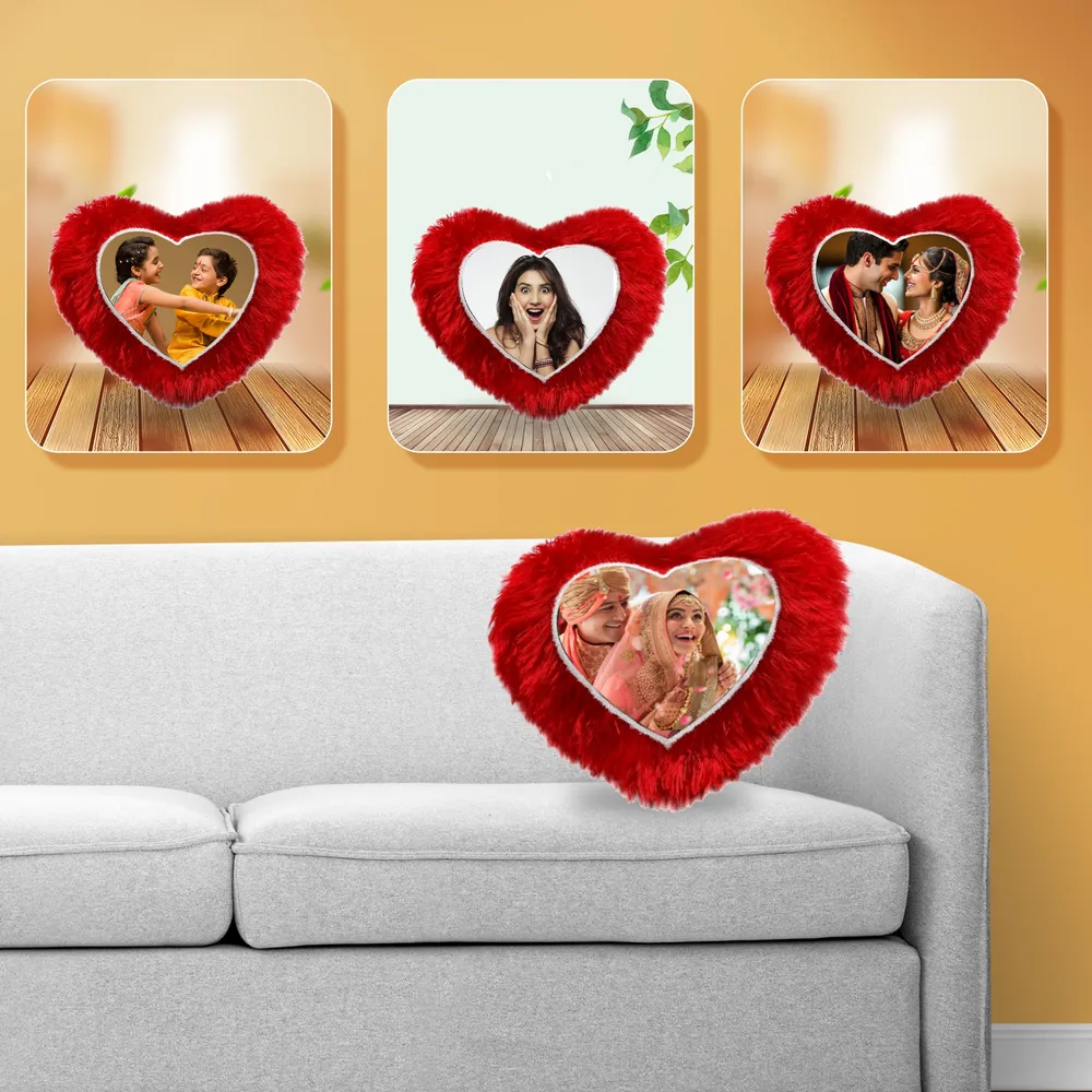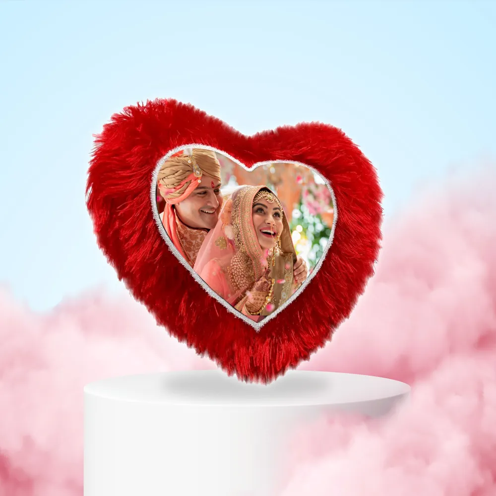 Feature Details Product Name Woodkey Heart Shape Personalized Cushion Shape Heart Material Premium Plush Fabric Print Type Custom Photo Print Size Standard (custom sizes available) Color Red (other options available) Ideal For Couples, Weddings, Anniversaries, Gifts Care Instructions Hand wash or gentle machine wash Delivery Pan India, safe packaging Perfect Gift for Every Occasion